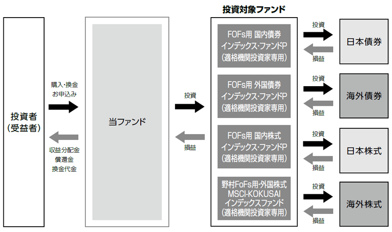投資者の皆さまからお預かりした資金を、直接株式や債券といった資産に投資するのではなく、株式や債券等に投資している複数の投資信託に投資して運用を行う仕組みです。