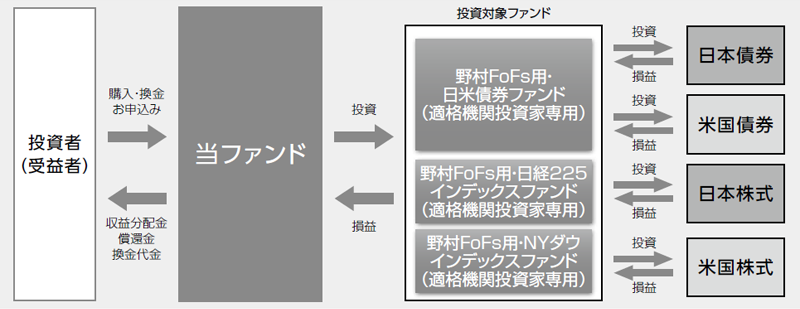 投資者の皆さまからお預かりした資金を、直接株式や債券といった資産に投資するのではなく、株式や債券等に投資している複数の投資信託に投資して運用を行う仕組みです。
